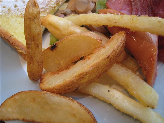 上星期六又殺去了一次,還是點了早午餐,這次選得是法式土司,也很好吃,而且有附楓糖漿喔!但是今天沒有沙拉,而是薯條跟薯塊,炸得酥酥脆脆的,熱呼呼的很好吃。