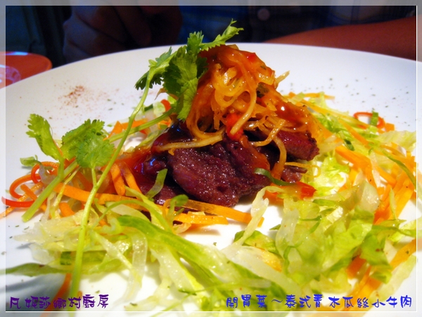 麵包吃完又過了一會兒之後才送來開胃菜 - 泰式青木瓜絲小牛肉,牛肉非常的嫩,有點辣辣的真的非常開胃、好吃。隔壁桌的女生點了杏鮑菇,跟他一起來的兩個男生也被她推薦點了杏鮑菇,害我們也在想說要不要點杏鮑菇呢?不過後來還是點了小牛肉,看來杏鮑菇應該也不錯。