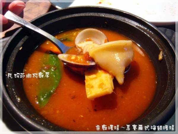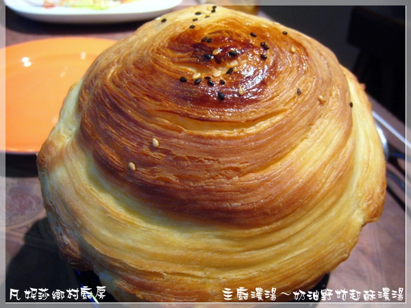 接下來上場的是主廚濃湯,我點的是酥皮濃湯(對酥皮毫無抵抗力啊~),他的酥皮跟外面的非常不一樣,一層一層的同心圓烤得非常酥脆喔,我直接就吃了,完全沒把它泡入湯裡,我喜歡酥酥的口感。