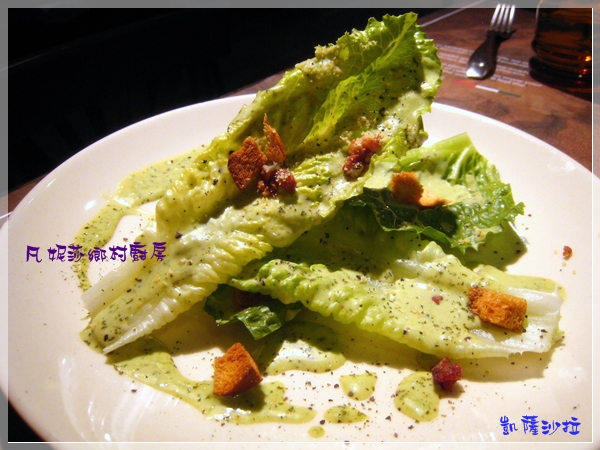 湯喝完後又隔了一會兒上來的是凱薩沙拉,看起來的感覺有點單調,不過凱薩沙拉好像就是這樣,味道當然也是很好。隔壁桌的女生點的是水果優格沙拉,是用一個很深的碗裝的,我原本也想點這個,不過後來覺得平常可以自己做,就改點凱薩啦!