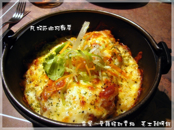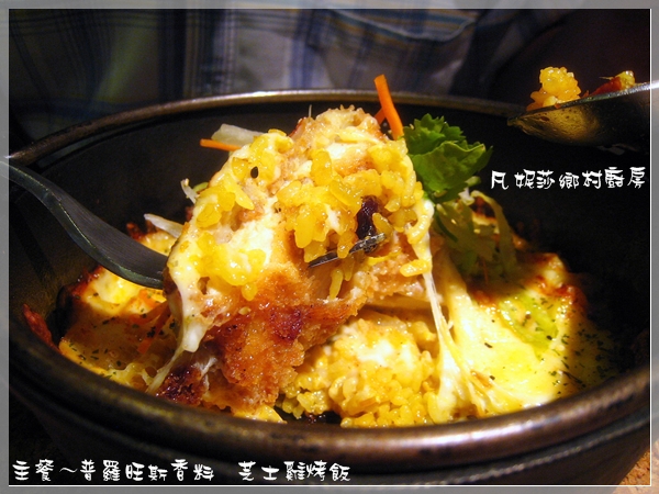 噹噹噹!主菜上桌囉,首先是普羅旺斯香料焗芝士雞烤飯(名字真是有夠長)。