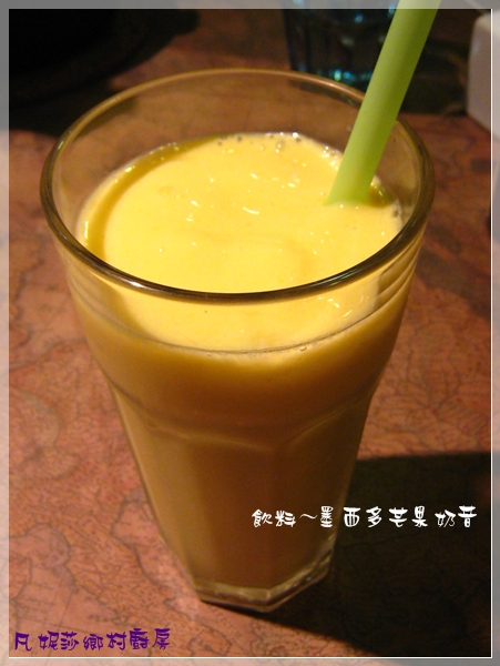 飲料是 --- 墨西多芒果奶昔(其實是冰沙),焗烤實在吃得很膩,所以請他趕快上個飲料,一口喝下去後~~~好清爽啊!把焗烤的鹹膩都去除了,好好喝唷!我們愛芒果~~~