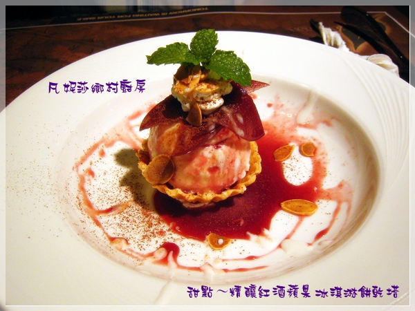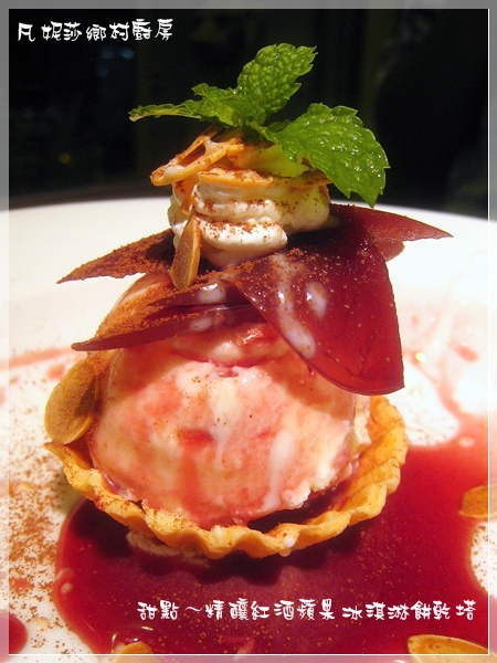 側面秀,那個紅虹像花瓣一樣的應該就是蘋果吧!下面是一球香草冰淇淋,然後是硬硬脆脆的餅乾塔,再裝飾上紅酒醬汁。