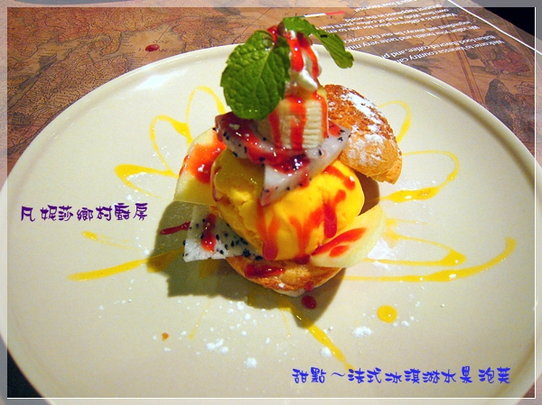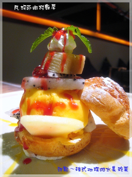再來是法式冰淇淋水果泡芙,顏色超鮮豔,內容也很豐富;原本害怕泡芙冰過之後會濕濕軟軟的影響口感,結果一點都不會喔!還好有把提拉米蘇換成這道冰淇淋泡芙,吃起來超幸福的!